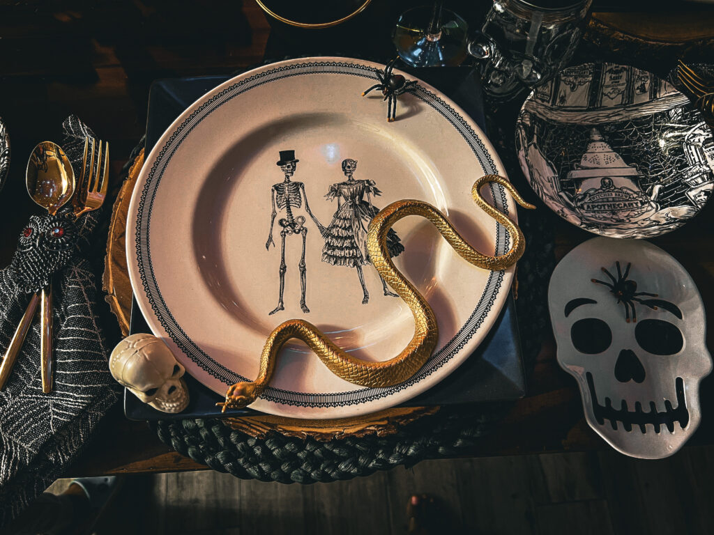 Elevate your table with elegant, dark-hued tableware. Opt for black or deep purple plates, delicate crystal glassware, and ornate flatware. Ensure that your choices exude luxury while maintaining the Halloween theme. These plates I love. I chose black base plates that I used as chargers with skeleton illustrations on the main plates. Then I put those on top of acacia wood chargers and black woven straw placements. In addition, I chose gold-rimmed black bowls for dessert and skull plates for bread.