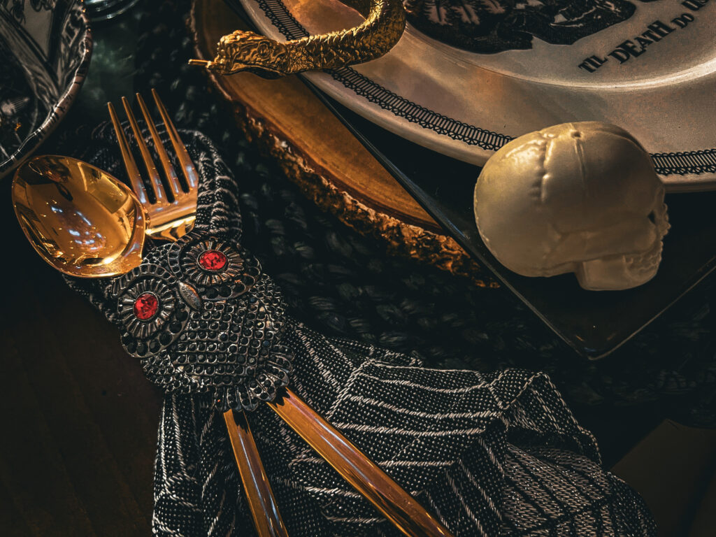 Gold flatware is hugged tightly by a black and red rhinestone owl, closely paired with a spider web napkin.