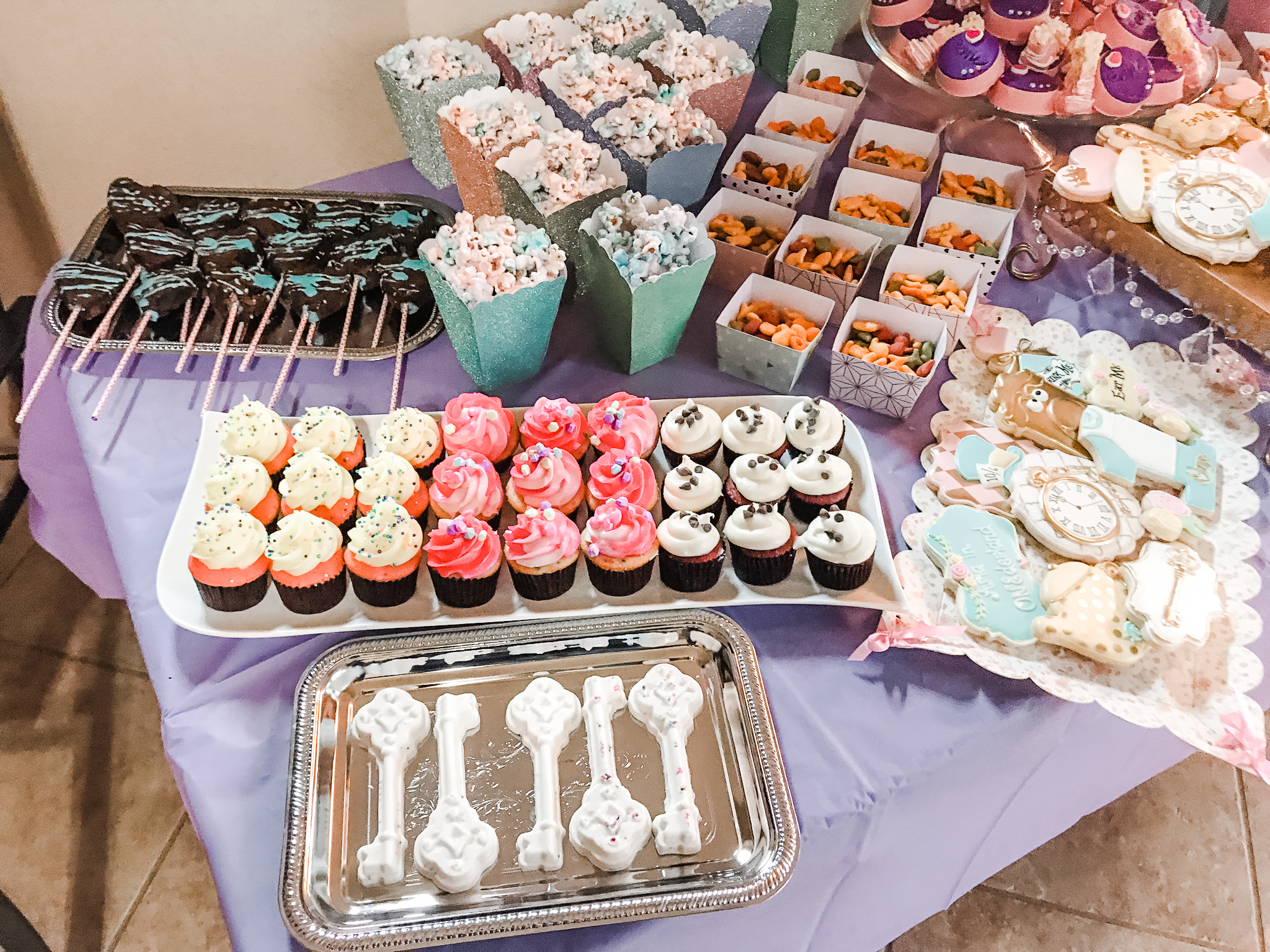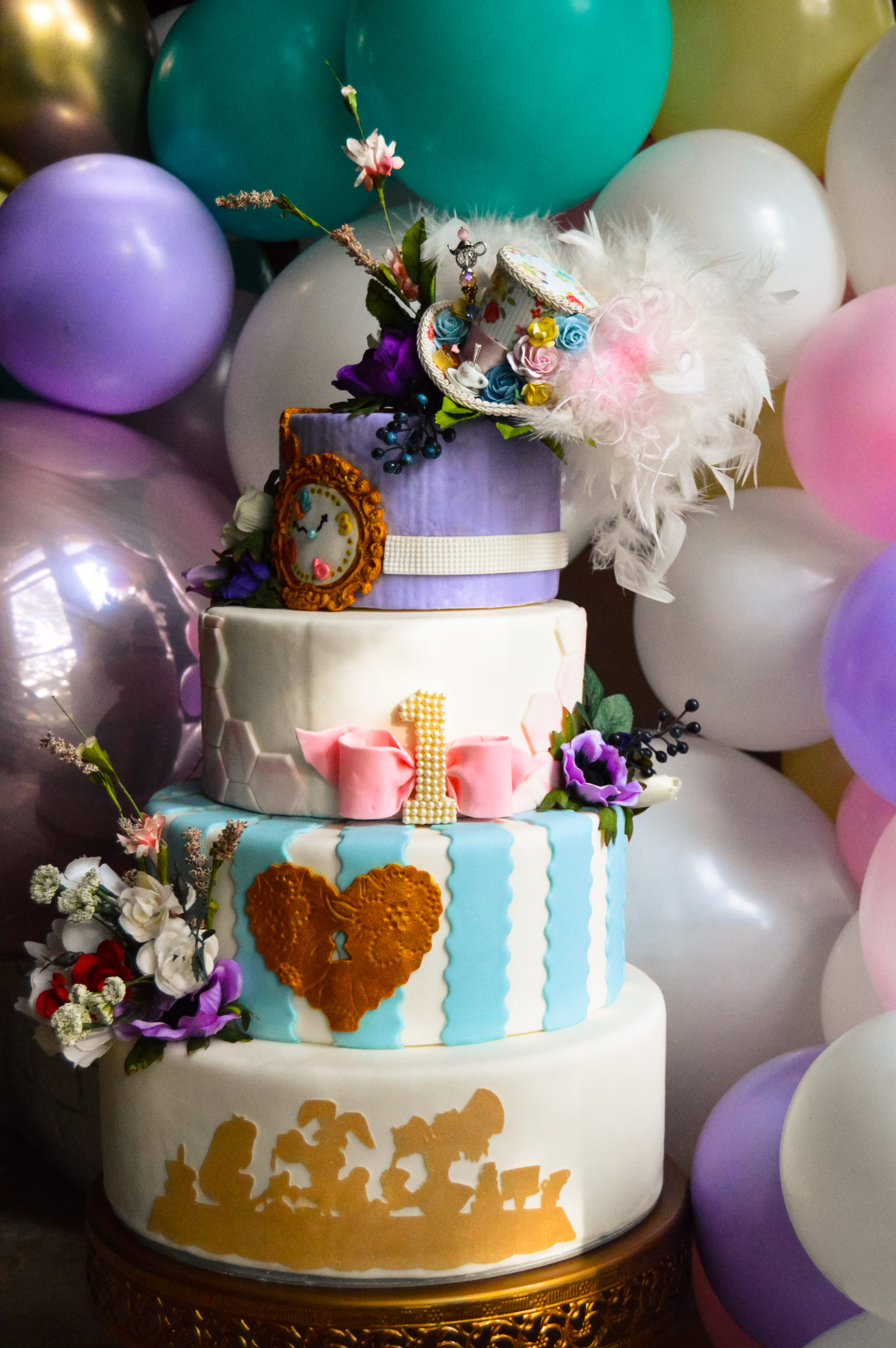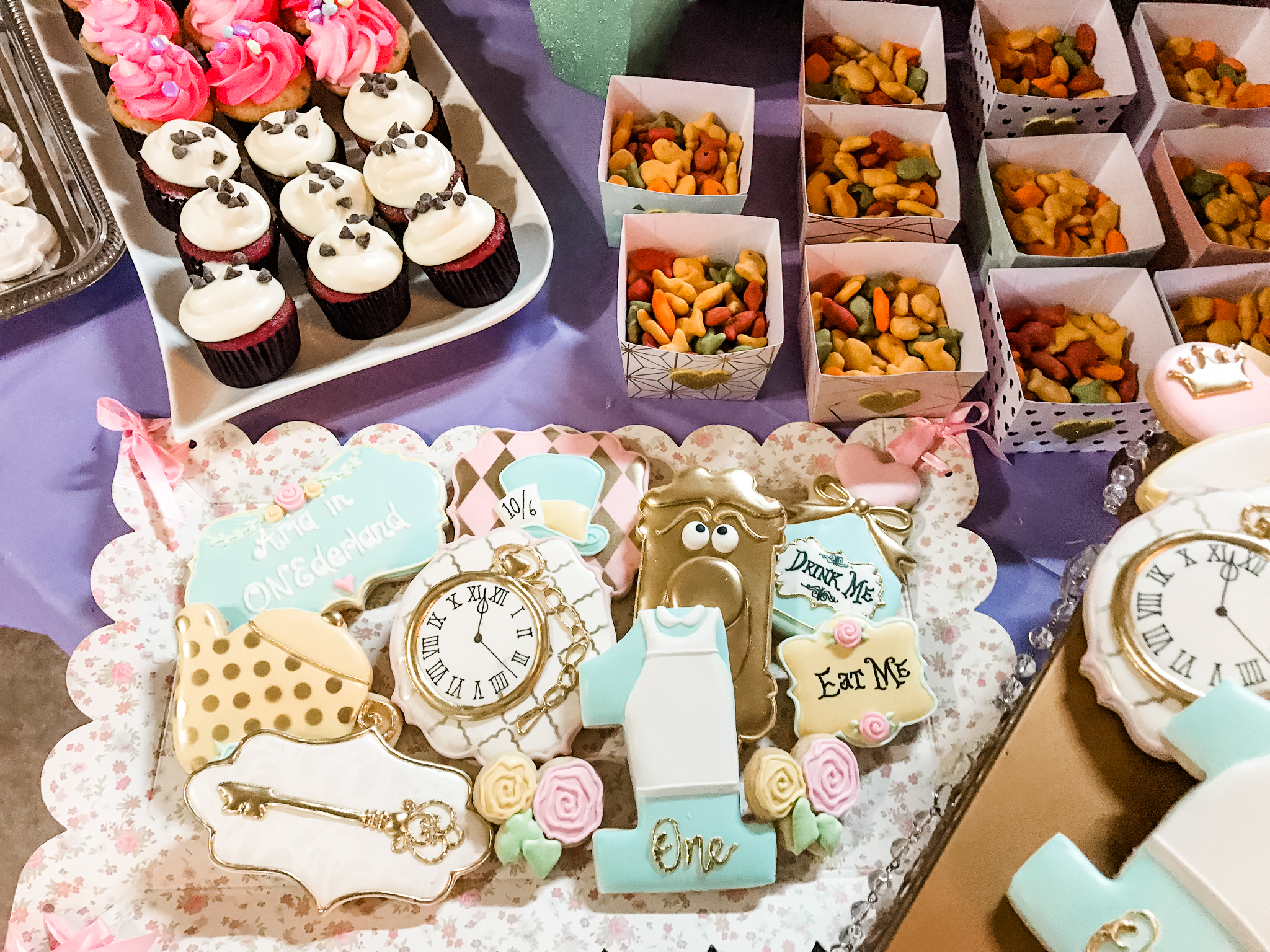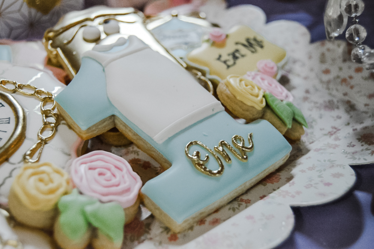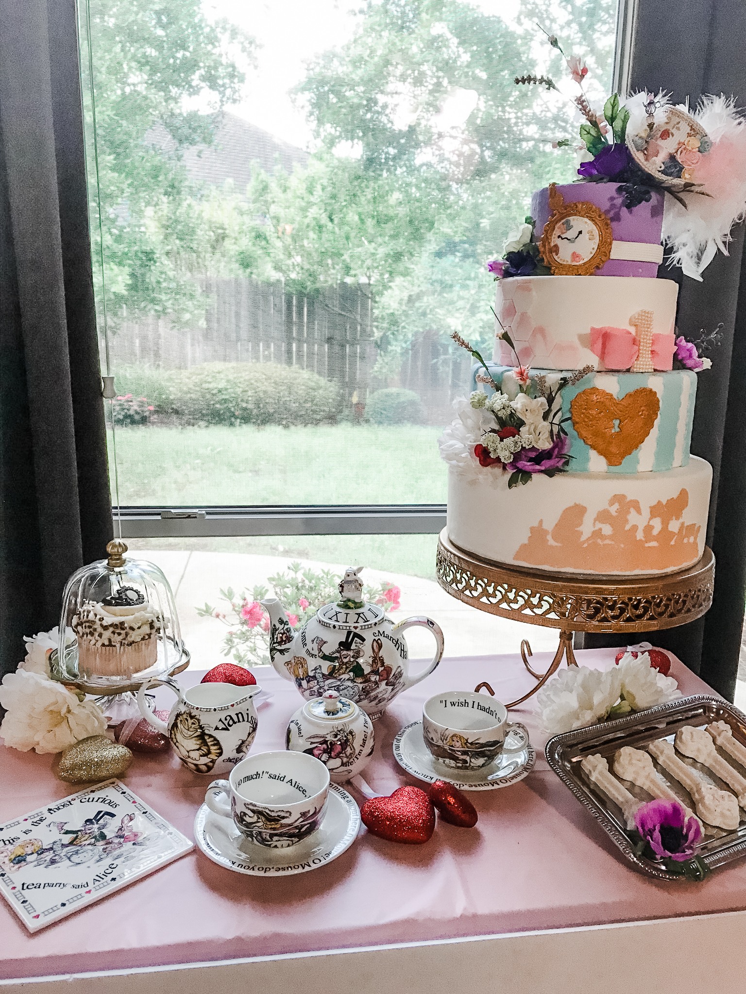 Like I said, I wanted to give a nod to the cartoon Alice in Wonderland, a cartoon that I loved when I was a kid so I had to pull out some heirlooms that I had when I was little and share. Of course there was a fabulous balloon arch, an area for the mome raths, the Cheshire cat and everything else under the sun.