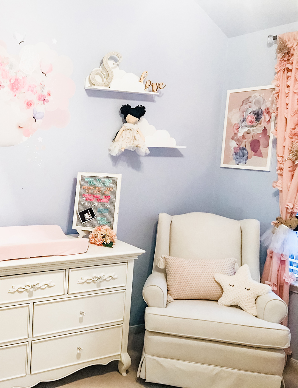 It turned out exactly the way I pictured it. Girly. Enchanted. Cozy. Cute. Luxurious, as far as babies go. There were a few DIY projects thrown in there as well, like the name frame, which I’ll talk about in another post, that made this nesting experience a great labor of love.