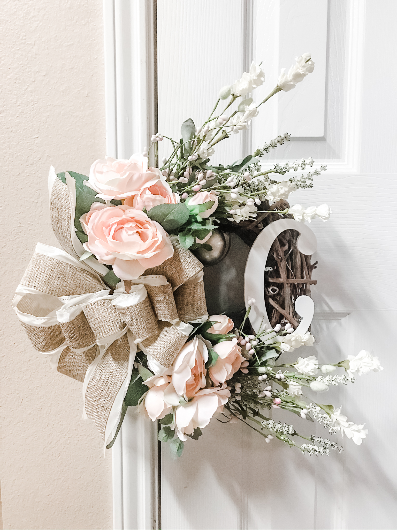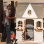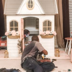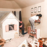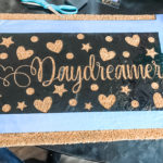 So that’s where we were. Hot. Flaming. Mess. Like I said, there was a lot to do – a lot of DIY stuff to take care of beforehand to make this vision become a reality. I had to paint the house – it was drab brown and green… bleh. That would never do. I decided on pink, gray, and white, with gold accents. I also had to make her “Daydreamer” mat. I used my Cricut for that, made the stencil and painted it in with the same paint I used for the house. Probably not the right paint, but whatever… This is a little of what that looked like.